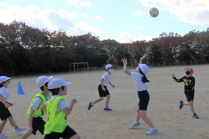 パスの出し方が少しずつ上手になってきた子どもたち。どこに投げればゴールに近づくのか,それぞれどんな役割で動けばよいのか考えて練習します。