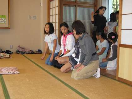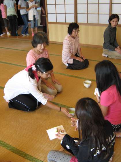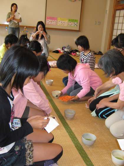 茶道教室では,4年生5年生も参加しています。この子たちは,茶のいただき方やお茶のだし方,立ったり座ったりする作法を教えてもらっています。回を重ねるごとに,スムーズな動きになっていく子どもたちです。