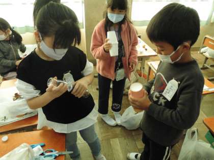 秋のものでおもちゃやかざりを作りました。子どもたちは,とても楽しそうにマラカスやけん玉,でんでんだいこ,まとあて,お面などを作っていました。