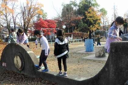 探検の後は,南福西公園で少し休憩&お楽しみをしました。秋めく公園で思いっきり走り回ったり,遊具で遊ぶ子どもたち。とっても楽しそうでした。