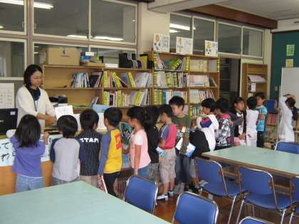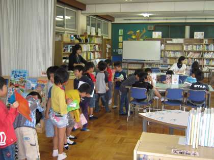 1年生は,この日借りていた本を返しに図書室にやってきました。子ども達は本を返すと,さっそく次に借りる本を探し始めました。