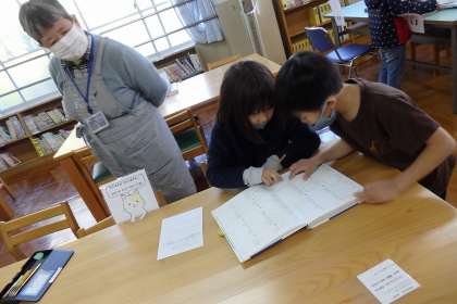 2年生は,「索引」について。図鑑の中から特定のものを調べたいとき,「索引」を使って素早く調べることや,調べたことの発表の仕方について学びました。宝探しゲームのように楽しんで活動に取り組んでいました。