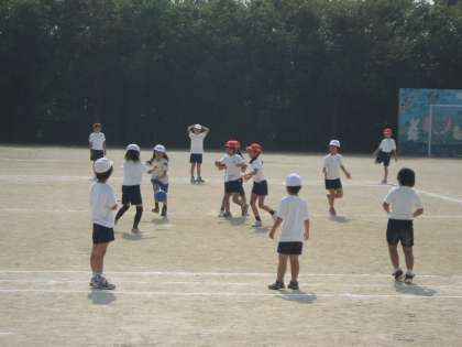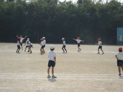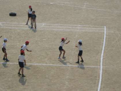 3年生になると,ボールをうまく投げたり受けたりしています。パスをどこにするとよいのか考えながらゲームをしています。