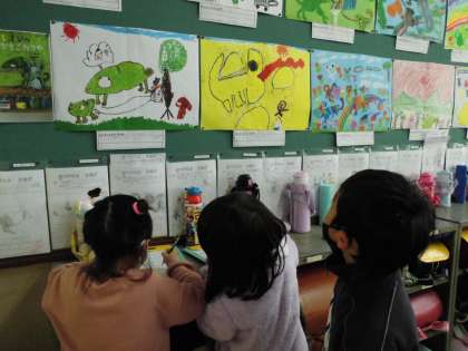 今日,図画工作の「おはなしからうまれたよ」の作品の鑑賞をしました。