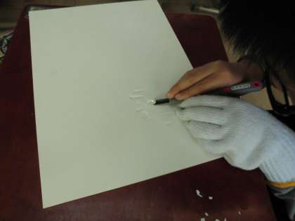 彫刻刀の持ち方や掘方を伝え,まずは版木の裏側を使って練習。