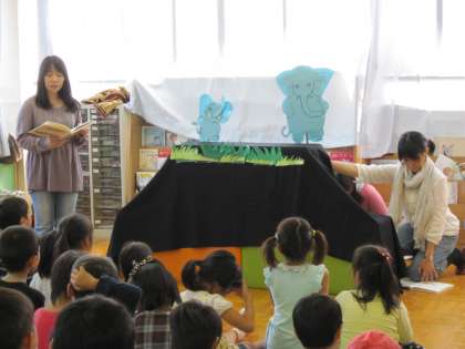 「とりかえっこちびぞう」の絵本の読み聞かせをしてもらいました。みんな身を乗り出しながら聞いていました。