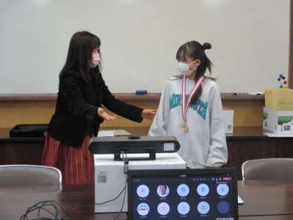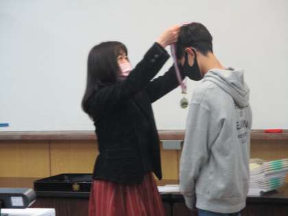 今日の朝会で一人一人,校長先生にメダルをかけて頂きました。