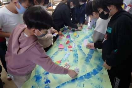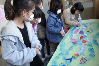 2年生の『卒業おめでとう』の掲示は,スイミーがテーマです。一人一人色や形が違っていても,みんなで一緒に楽しそうに泳ぎます。