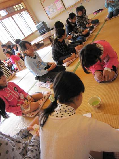 4・5年生は,お茶の出し方やいただき方を練習しました。はじめのころは,次に何をしたらいいのか戸惑う子が多かったですが,4回目となり次にすることを思い浮かべながら出来るようになってきました。