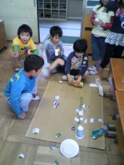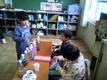 この学習で,福西公園や学校で集めた秋の木の実や葉を使っていろいろなものをつくりました。つくったものを使って,1・2組合同で「あきのおみせ」として交流をしました。