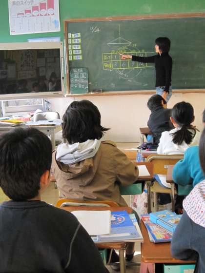 5年生は,算数で「面積」の学習をしています。この日は,「三角形の面積で,底辺の長さが2倍3倍…と増えていく時面積はどう変わっていくか。」について考えました。