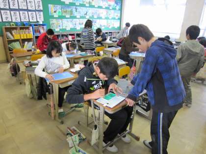 子ども達は,下絵を版木に写し,彫刻刀で彫り進んでいきます。真剣に彫刻刀を使っていました。