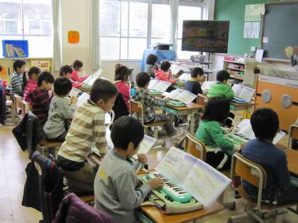 1年生は,音楽の時間にけんばんハーモニカで演奏を楽しんでいます。