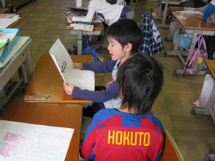 少し照れながらも,自分の作った図鑑を懸命に紹介していました。