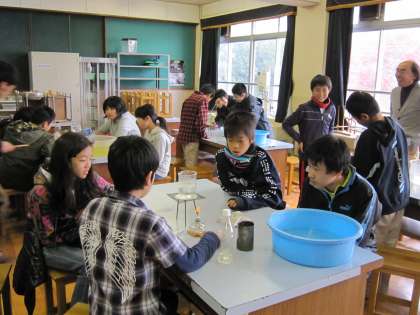 各テーブルに実験器具を準備し,興味深く実験に取り組んでいました。