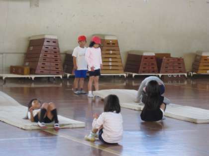 2年生は,体育で「マットあそび」に取り組んでいます。一人ひとり自分のめあてカードをもって,新しい技にチャレンジしています。