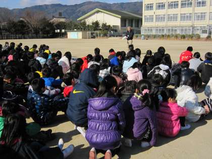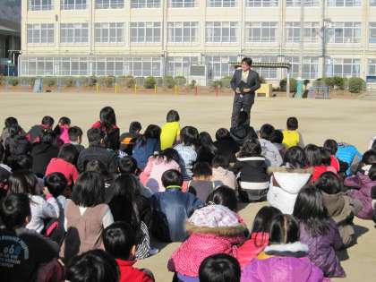運動場に避難した後,学校長は「もしものときに,行動できるように,訓練のときには,冷静に・静かに・今どういう状況なのか・次にどうしたらいいのかを考えて行動しましょう。」と話しかけました。子どもたちは,うなずきながら真剣に話を聞いていました。