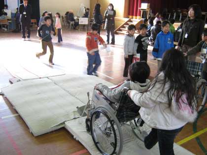車椅子についてのブースでは,コースを屋外から体育館の中に変更して活動しました。