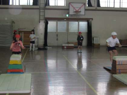 一人が跳ぶと次の人に,跳んで大丈夫だよという合図を送りながら楽しく活動しています。