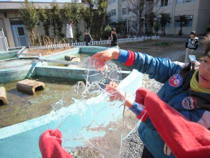 この日(2月9日)も中間休みに観察池に行くと,写真のように氷が張っていました。