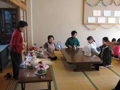 2月11日の土曜日には,福西女性会の皆さんのご協力で,生け花教室を行いました。子どもたちは,福西女性会の皆さんにアドバイスしていただきながら,生け花を楽しみました。