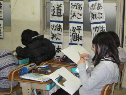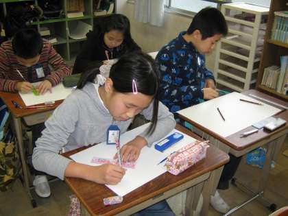 5年生は,算数で「角柱と円柱」の学習をしています。この日(3月5日)は,三角柱の展開図を工作用紙にかき,三角柱をつくりました。