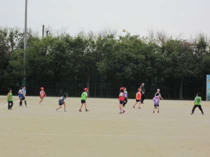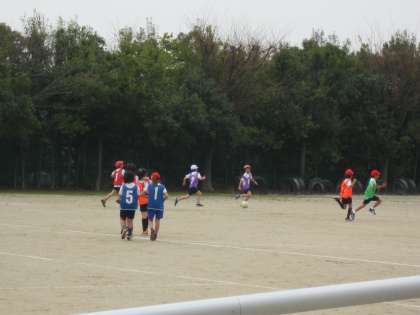 3年生は,体育でラインサッカーをしています。子どもたちは元気いっぱいボールをけりパスしゲームを楽しんでいました。