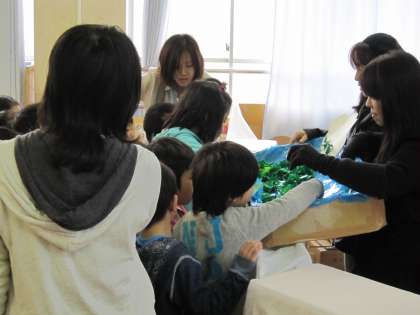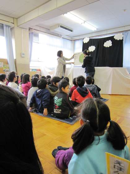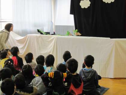 お話は「999ひきのきょうだいのおひっこし」でした。途中でカエルが出てきたりして子どもたちは興味深く見ていました。最後には折り紙で折ったカエルをもらって大喜びの子どもたちでした。