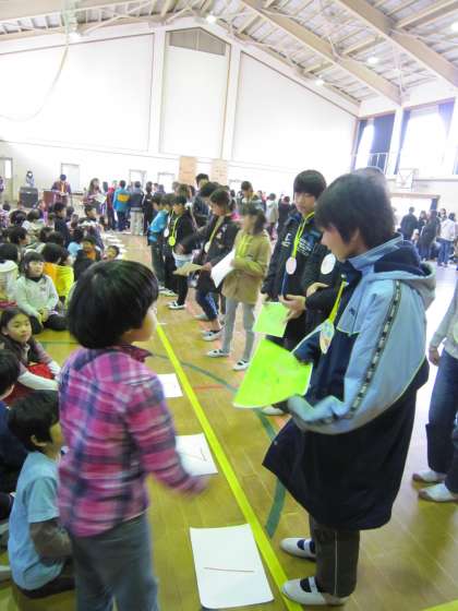 そのあと,1〜5年生全員つくった「メッセージカード」をなかよしグループの6年にグループごとに渡しました。6年生はもらう時に少し照れながらも笑顔でもらっていました。