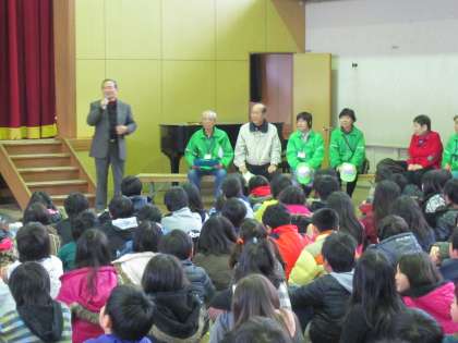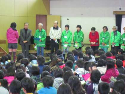 この日(3月9日)の児童集会では,福西安全見守り隊の方々への感謝のつどいを行いました。