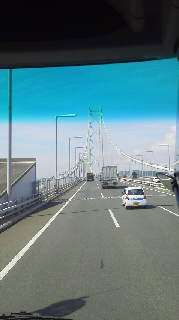 福西小学校を出発した6年生たちは明石海峡大橋を越えてハイウェイオアシスで休憩をとり,笑顔で集合写真を撮りました。
