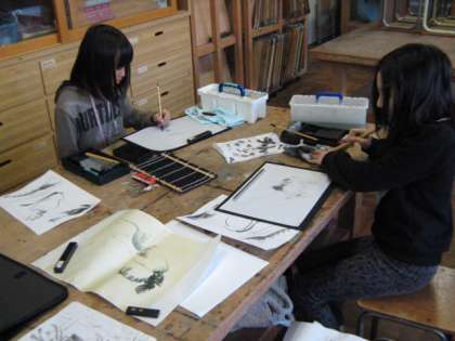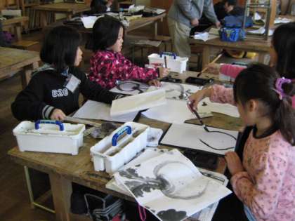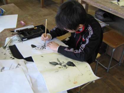 2回目の美術教室がありました。植物や野菜,動物を題材に墨絵で表しました。筆の使い方や墨の濃淡等を工夫して,作品に取り組みました。