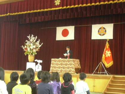 4月6日福西校に43名の新入生がやってきました。入学式で学校長より3つの約束(進んであいさつしよう・友達をたくさんつくろう・自分の事は自分でしよう)を守って楽しい学校生活にしようと話しかけました。しっかりと学校長を見て話を聞いている1年生です。