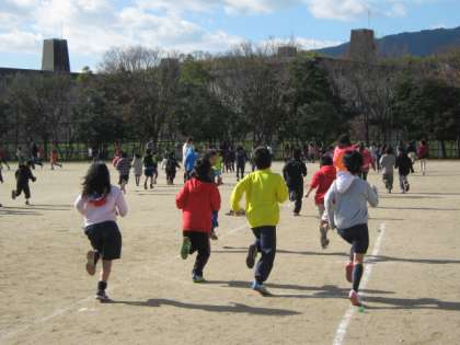 1〜3年生は1周100m,4〜6年生は1周200mのトラックを音楽に合わせて5分間走ります。
