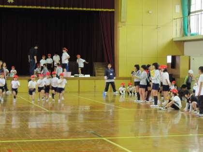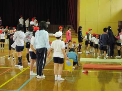4月13日(火)6年生は1年生といっしょに「新体力テスト」を体育館でしました。20mシャトルランや立ちはばとびなどをしました。1年生の記録をとったり自分の力を確かめたりしました。