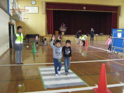 体育館につくられた道路を使って練習したり、雨の日の正しい傘の差し方を練習したりしました。