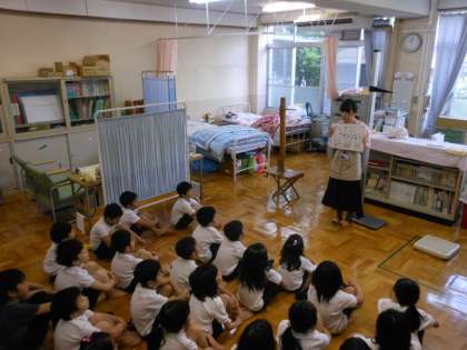 4月は検診が多い月です。今日は身体計測がありました。岡本先生が保健室でのルールの確認と,体に関するクイズをしてくださいました。お話の間,しっかりと並んで話を聞くことができました。また,手首から肘までと,足の大きさがほぼ同じだと知り,驚いた様子でした。