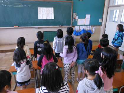 1年生は校歌の学習をしています。今日は2年生がお兄さん,お姉さんとして一緒に歌って見本を見せました。大きな声とぴったり揃った音程で歌うことができました。次は学校探検にも一緒に行く約束をしました。