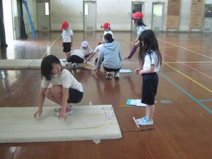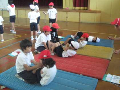 「上体起こしは,こうするんだよ」「反復横跳びは,この線をまたいでね」など6年生にたくさん教えてもらいました。教えてもらっている間,1年生は真剣なまなざしで6年生の話しを聞くことができました。