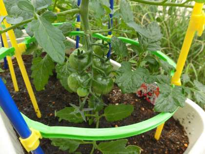 今日水やりに行った時,びっくり!!ミニトマト第一号が色づいています。まだ食べるのには早いのでそのままにしておきましたが,とてもうれしい出来事でした。ほかのミニトマトはまだ緑色ですが,しっかり大きく膨らんできています。