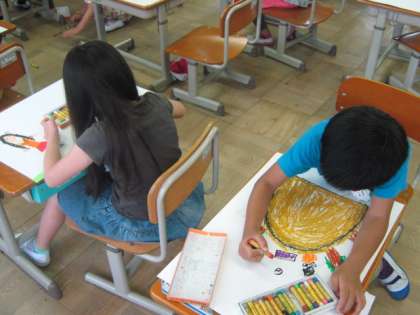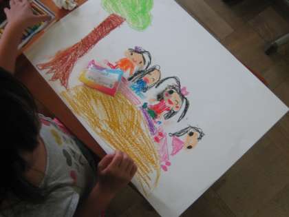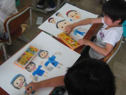 先週2・3年生と行った遠足や給食,6年生との体力テストなどをクレパスでしっかり描いています。