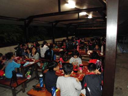 一日目の夕食です。少し寒いので、温かい味噌汁がよけいにおいしく感じます。おかわりをする子どももたくさんいました。