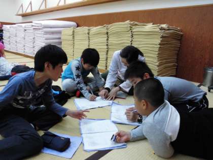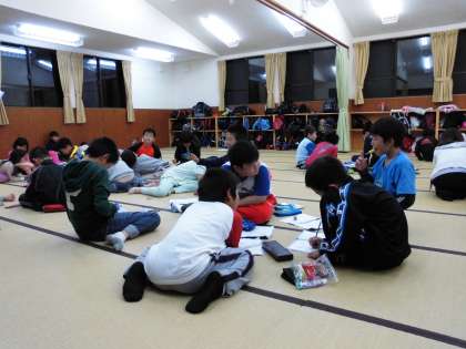 一日目のすべての活動を終えました。今日一日を振り返って、班ごとに反省会をしました。