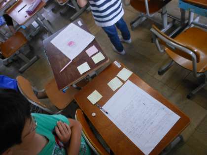 育てているミニトマトのかんさつ文を仕上げました。できあがった友だちのかんさつ文を読んで,上手に書けているところ,名人のわざを使っているところを見つけて感想を書きあいました。