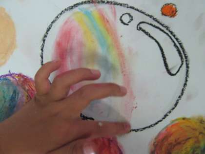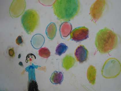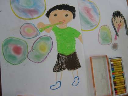 1年生は図工の学習で「しゃぼんだま とんだ」というテーマで自分がシャボン玉で遊んでいる様子を絵にしています。