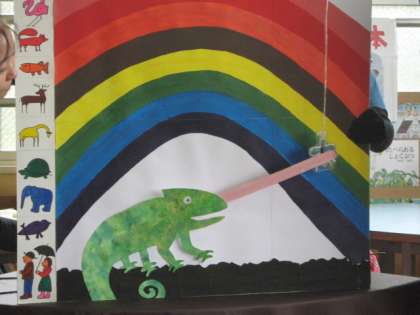 今日のおはなしは、エリック・カール作『ごちゃまぜカメレオン』でした。