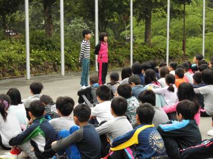 午前7時から「朝の集い」です。今日は、山階南小学校、岩倉北小学校、嵐山小学校と福西小学校の四校が集まりました。