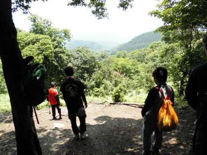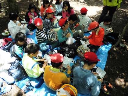 天狗杉に到着!待ちに待ったお弁当タイムです。クラスごとに一枚のブルーシートに座って仲良く、