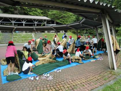 昨晩、お世話になった寝袋を片付けます。所員さんに方法を教えてもらった後、みんなで協力して片付けました。