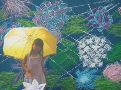 クレパスでアジサイの花や葉っぱを描き、白色の絵の具で雨を表現し、そこに傘をさした自分の姿(写真)を貼りつけました。そして、足元に花びらを散らしました。